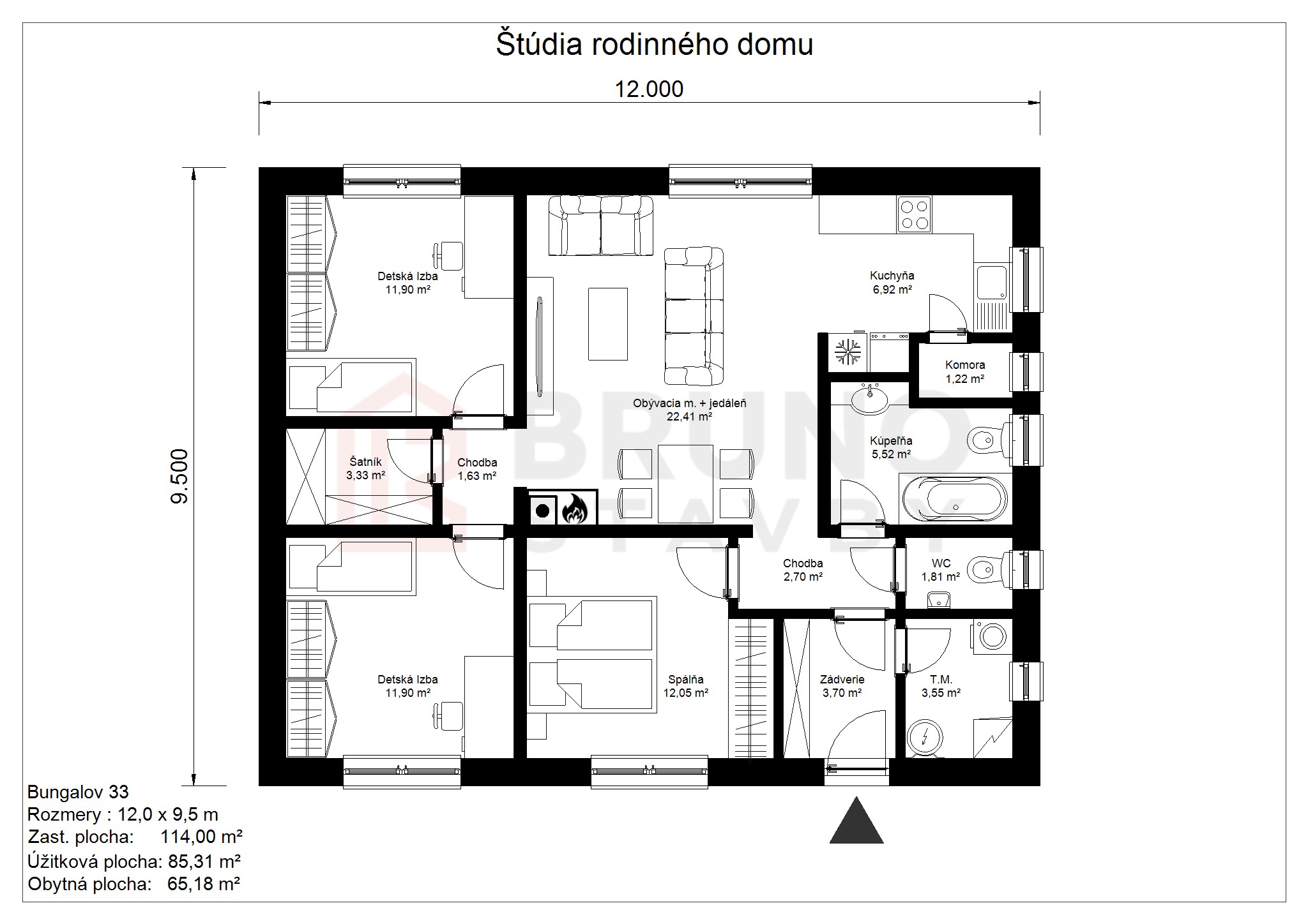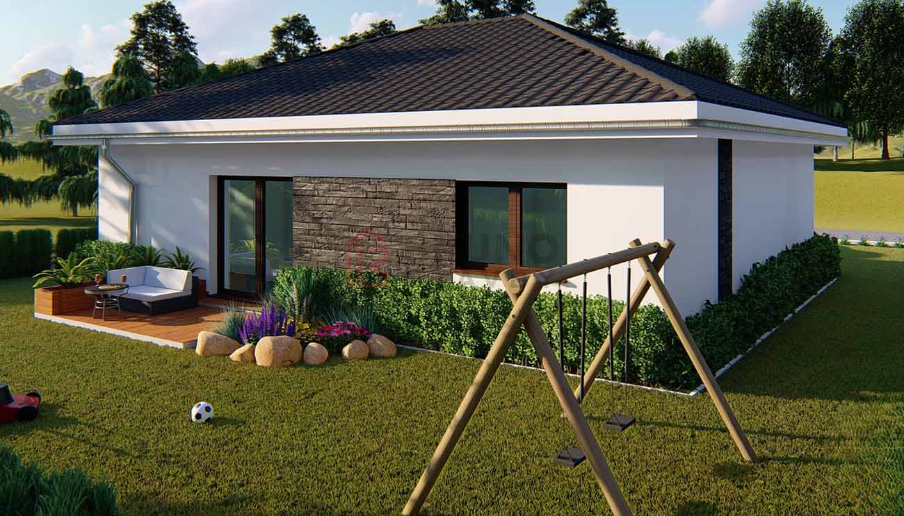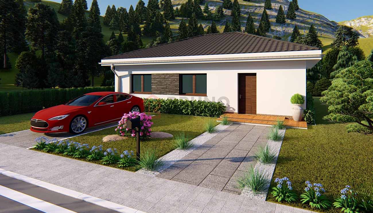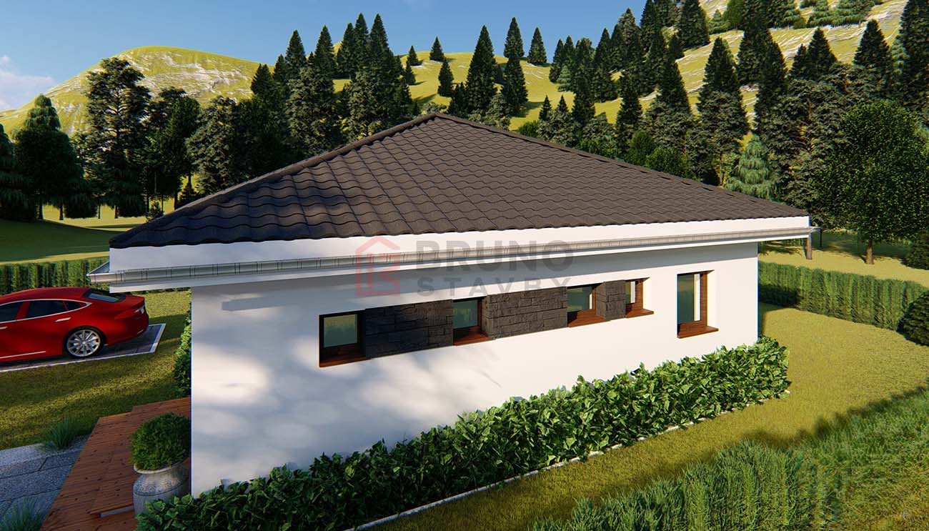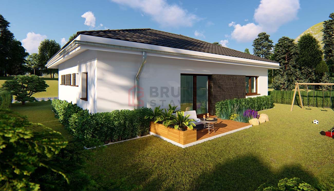 4 - pokojový rodinný dům. V domě se nachází obývací pokoj s kuchyní, spíž, tři ložnice, šatna, koupelna, samostatné WC a technická místnost. Všechny ceny jsou včetně DPH. Dům vyhovuje podmínkám energetické třídy A0.